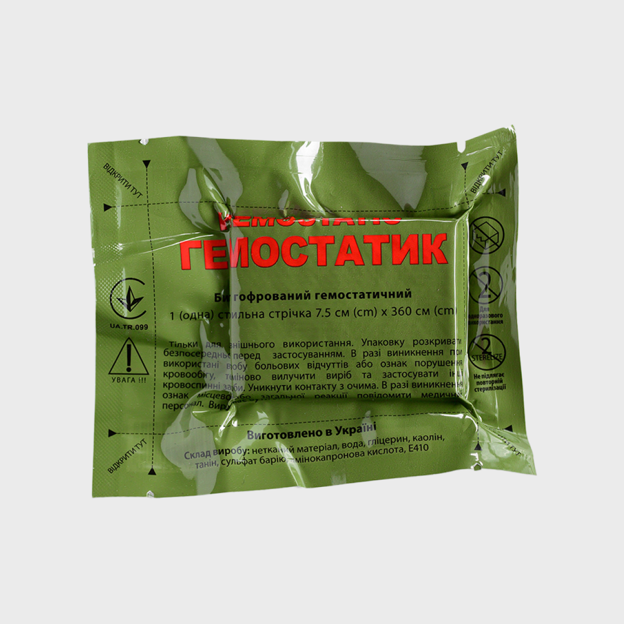 Combat Gauze is a type of hemostatic dressing that is used to control severe bleeding from traumatic injuries. It is a specialized type of gauze that is impregnated with a substance called Kaolin, which is a natural mineral that helps to promote blood clotting. Purchased in Ukraine.